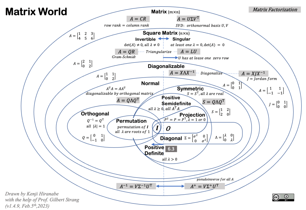 Prof. Strang will soon start a new MATH 18.06 class at MIT. As you know, it has been one of the most popular Linear Algebra classes in the world. As I exchanged ideas with him for sometime, here’s the latest version of “Matrix World” going with his class.